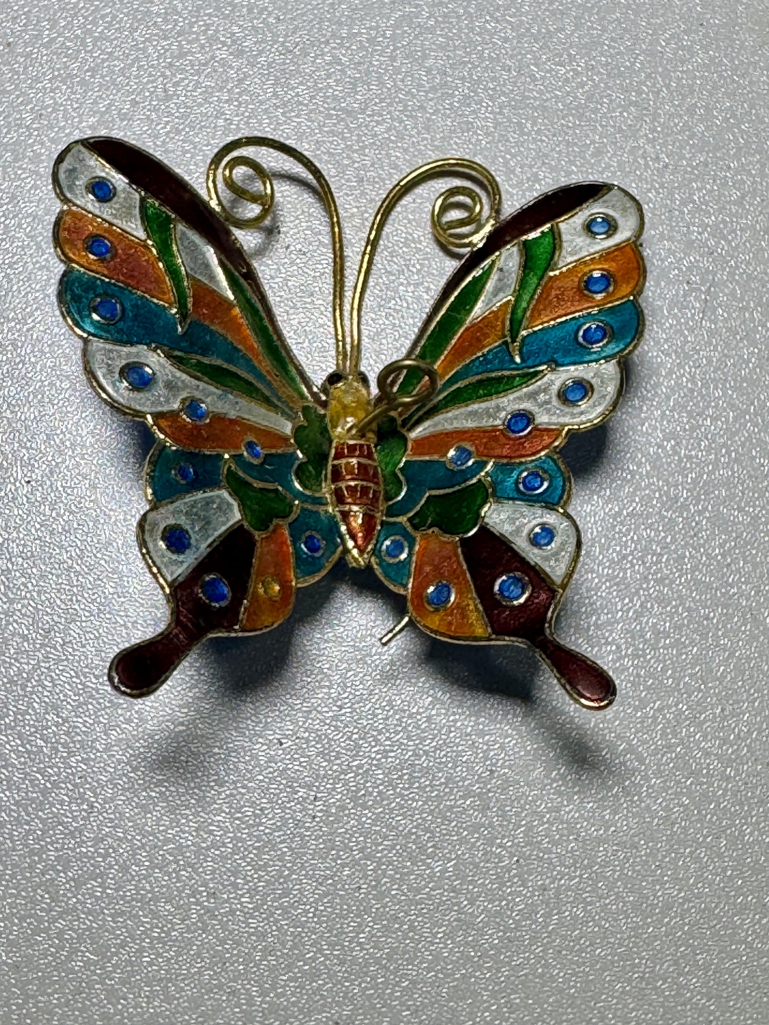 Bright, whimsical, and beautifully symbolic, this Cloisonné Butterfly Ornament brings vibrant color and delicate artistry to any décor. Handcrafted using traditional cloisonné techniques, each wing is outlined with fine metal wire and filled with shimmering enamel in rich tones of teal, amber, emerald, white, and sapphire blue.