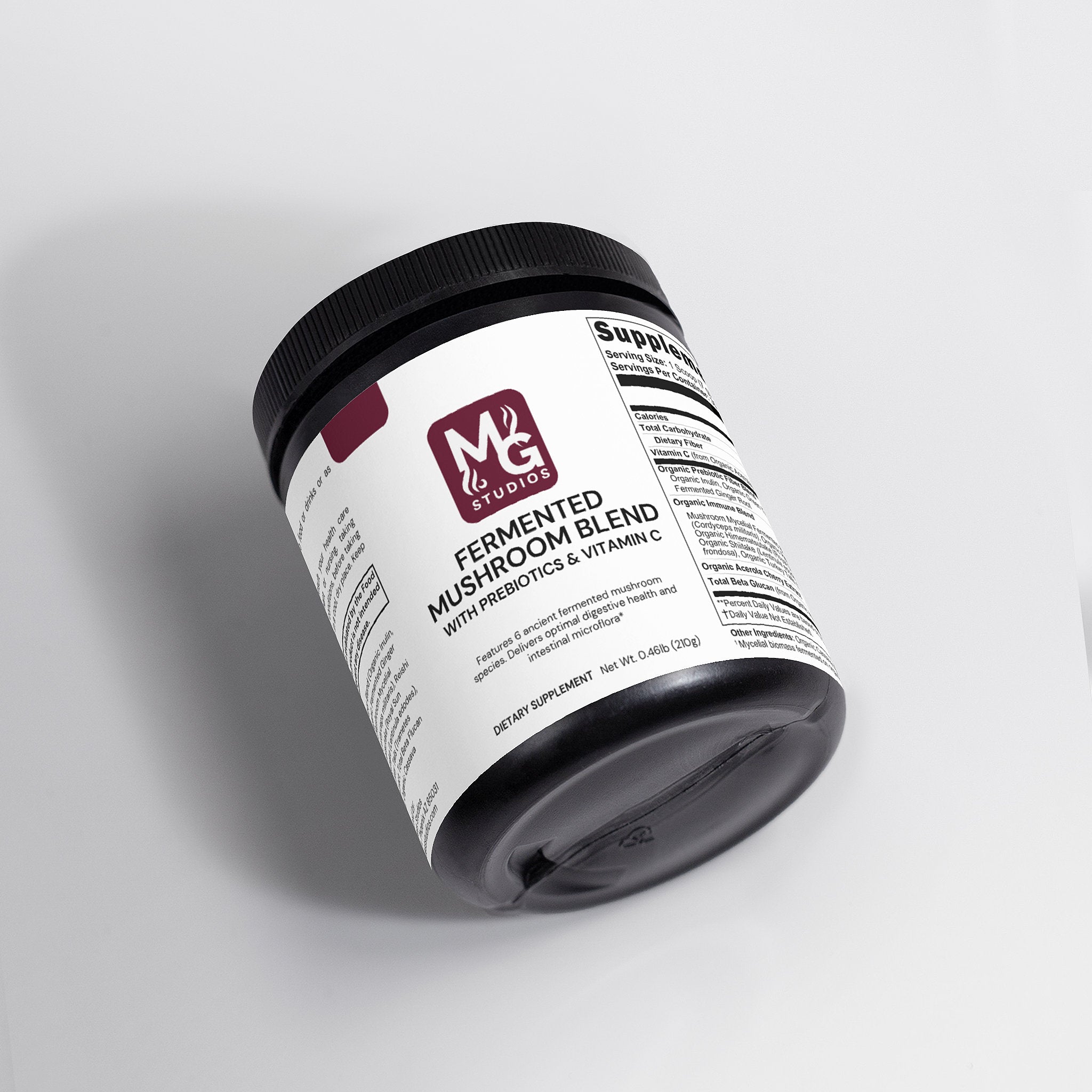 Ingredients: Vitamin C, Organic Prebiotic Fiber Blend (Organic Inulin, Organic Green Tea Extract, Organic Fermented Ginger Root), Organic Immune Blend (Mushroom Mycelial Biomass Blend,[Cordyceps (Cordyceps militaris), Reishi (Ganoderma lucidum), Himematsutake (Royal Sun Agaricus) (Agaricus blazei), Shiitake (Lentinula edodes), Maitake (Grifola frondosa), Turkey Tails (Trametes versicolor)], Acerola Cherry Extract, Total Beta Flucan (from Organic Immune Blend), Organic Cassava Maltodextrin